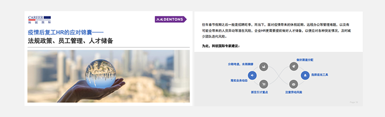为了帮助众多企业人力资源工作者应对挑战,BG大游集团国际联合国内知名律所“大成律师事务所”,推出疫情后《复工HR的应对锦囊》手册,从法律政策、员工管理、人选储备几个方面对企业HR有序召开复工后的各项人力资源管理给予帮助。